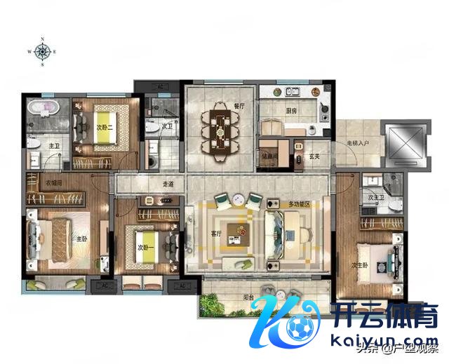 中间客厅和书斋造成大横厅,外包围全尺寸阳台,不错得志生计上的各式喜爱,客厅和餐厅正向南北通透,墙体严格对皆,特出漂亮。餐厅、厨房横向罗列,就餐烹调的动线极其流通。餐厅操纵还有一个小的收藏室,不错行为一个藏宝室,便捷把网罗来的桂林一枝特出便捷的放弃在这里,同期也不错作为一个酒窖,储存陈大哥酒好像海外的红酒,突显个东谈主的回味。