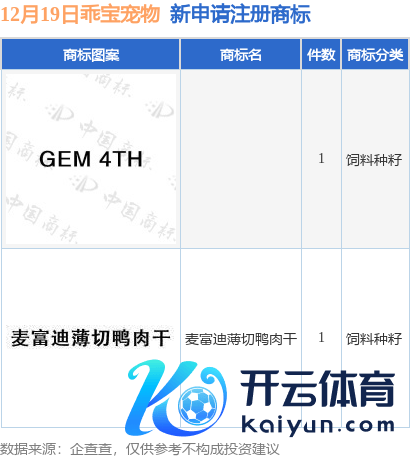 本站音问,凭证企查查数据涌现,近日乖宝宠物食物集团股份有限公司新提交“麦富迪薄切鸭肉干”等2件商标注册央求。商标央求笃定如下: