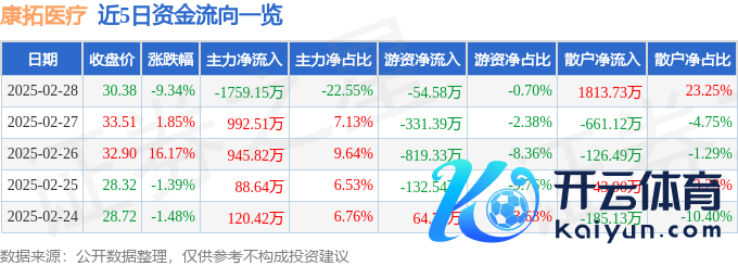 本站音问,规律2025年2月28日收盘,康拓医疗(688314)报收于30.38元,着落9.34%云开体育,换手率3.04%,成交量2.47万手,成交额7800.28万元。