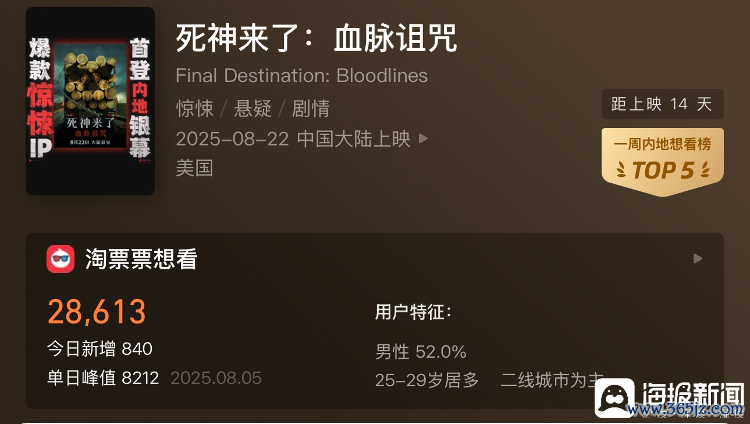 近日,华纳兄弟电影官微晓示,经典恐怖片系列新作《死神来了:血脉怀念》(《死神来了6》)定档8月22日中国内地上映,这是“死神来了”初度登陆内地院线。此音信一出,快速登上各平台热搜,激勉网友闲居善良,不少网友纷繁齰舌“活久见”。可见,《死神来了6》无疑是暑期档的又一重磅炸弹。