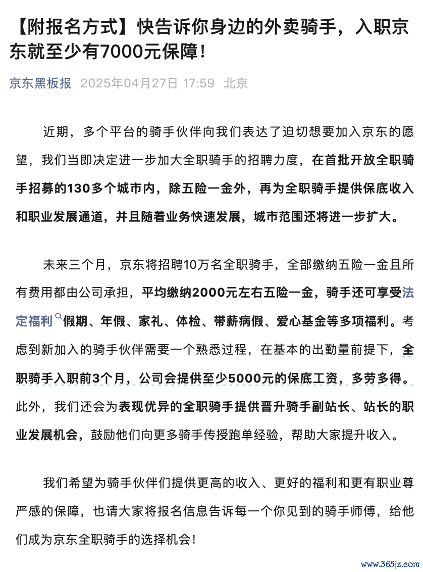 京东:昔日三个月将招聘10万名全职骑手